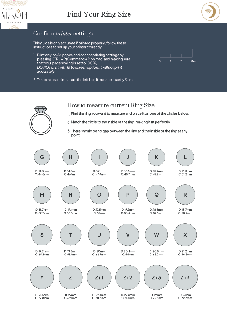 It is best to have your ring size measured professionally, either by Aileach Moon or by popping into your local jeweller. If this is not possible you can print off the PDF charts below to measure your size using an existing ring.