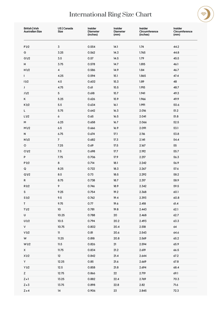 If you are unable to get to Aileach Moon or your local jeweller, you can measure your ring size by printing off the PDF file below and following the instructions carefully. Place an existing ring over the circles to find the best fit. Aileach Moon’s tools are calibrated to the international size chart.